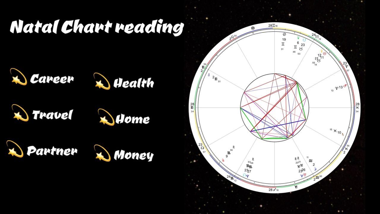 A natal chart reading is a personalized astrological analysis based on the positions of the planets at the exact time of your birth. This reading offers deep insight into your personality, strengths, challenges, and life path.